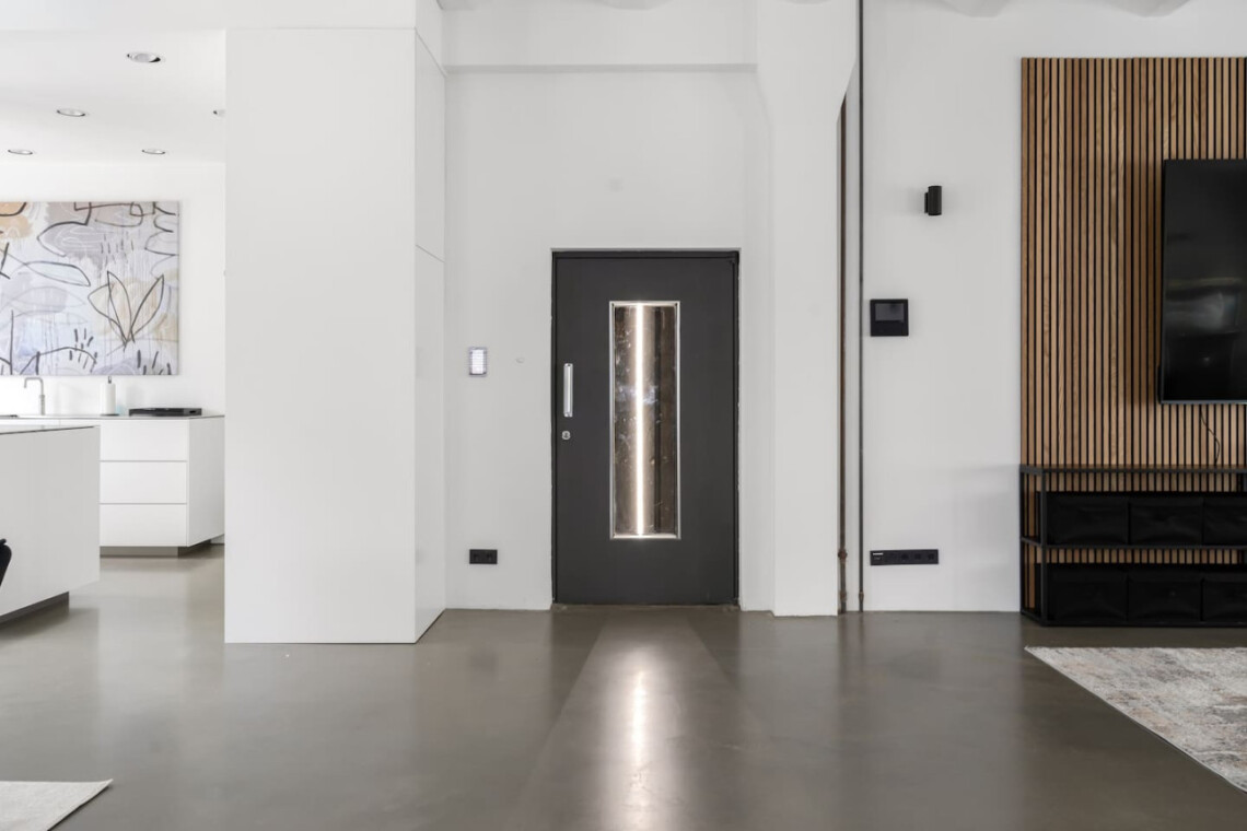 The BEYOND LIVING loft is characterized by the high-quality floor made of polished screed, which covers the entire living area, high ceilings and white plaster on all walls throughout the loft.